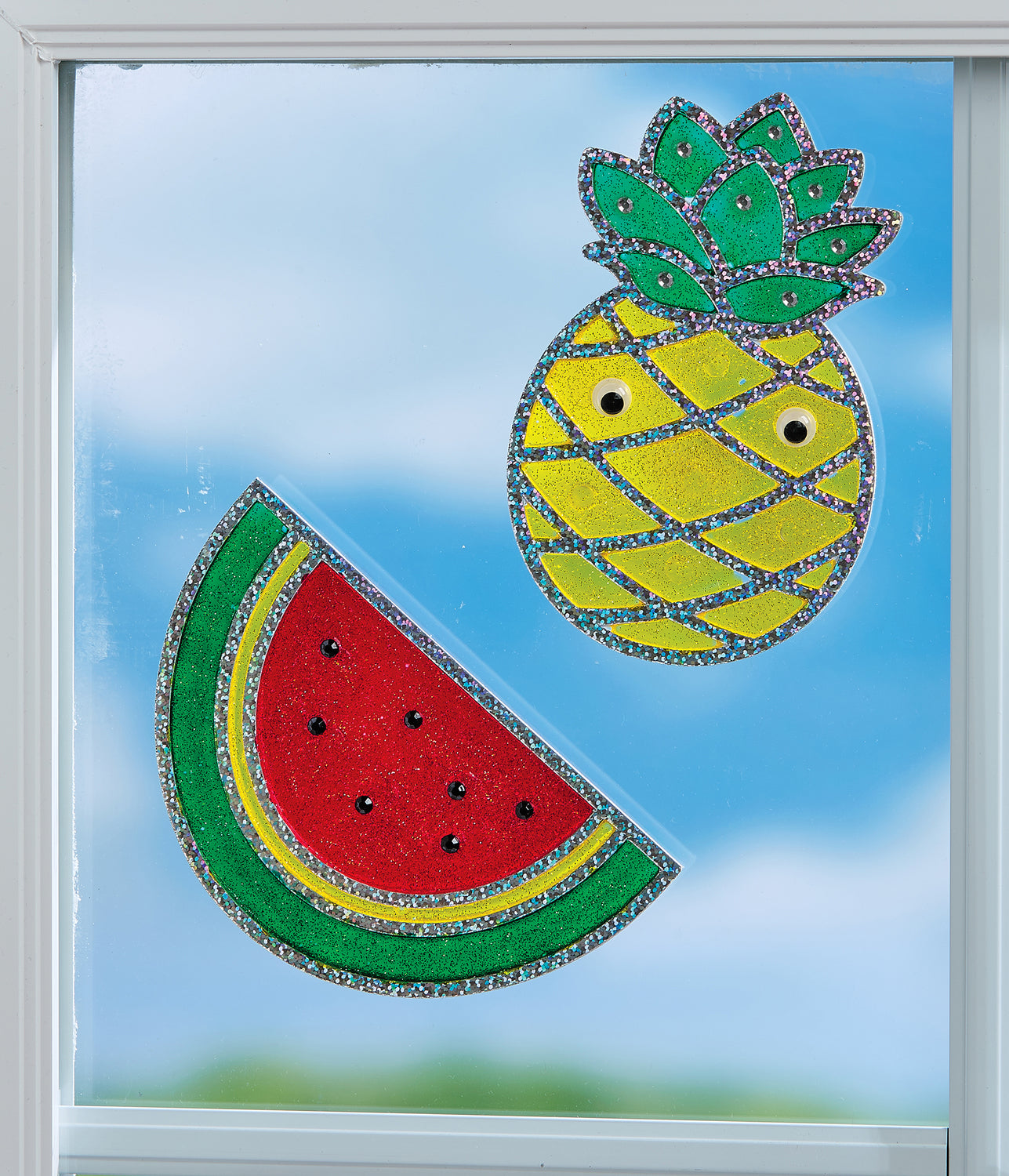 2 foil designs (approximately 5” x 6”) come ready to decorate with an array of sparkle window paint and rhinestones or wiggly eyes.