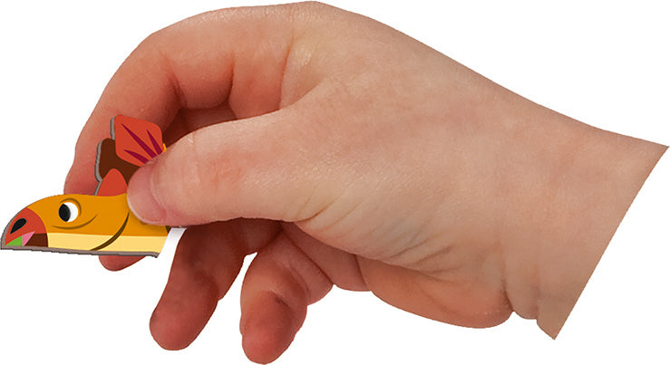 Cardboard magnetic educational game based on the theme of dinosaurs, composed of 40 magnets and 10 cards with the dinosaur's Latin name. Once the book is opened, the object of the game is to use the magnetic background for the placement of magnets to recreate the dinosaur indicated on the card. Children can also have fun mixing the various interchangeable pieces to create creatures that are even scarier
