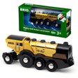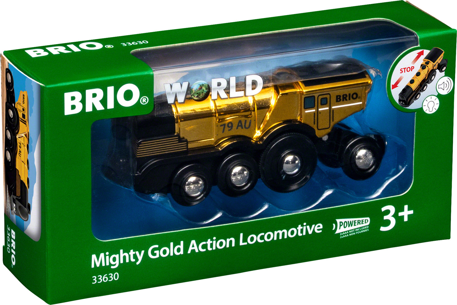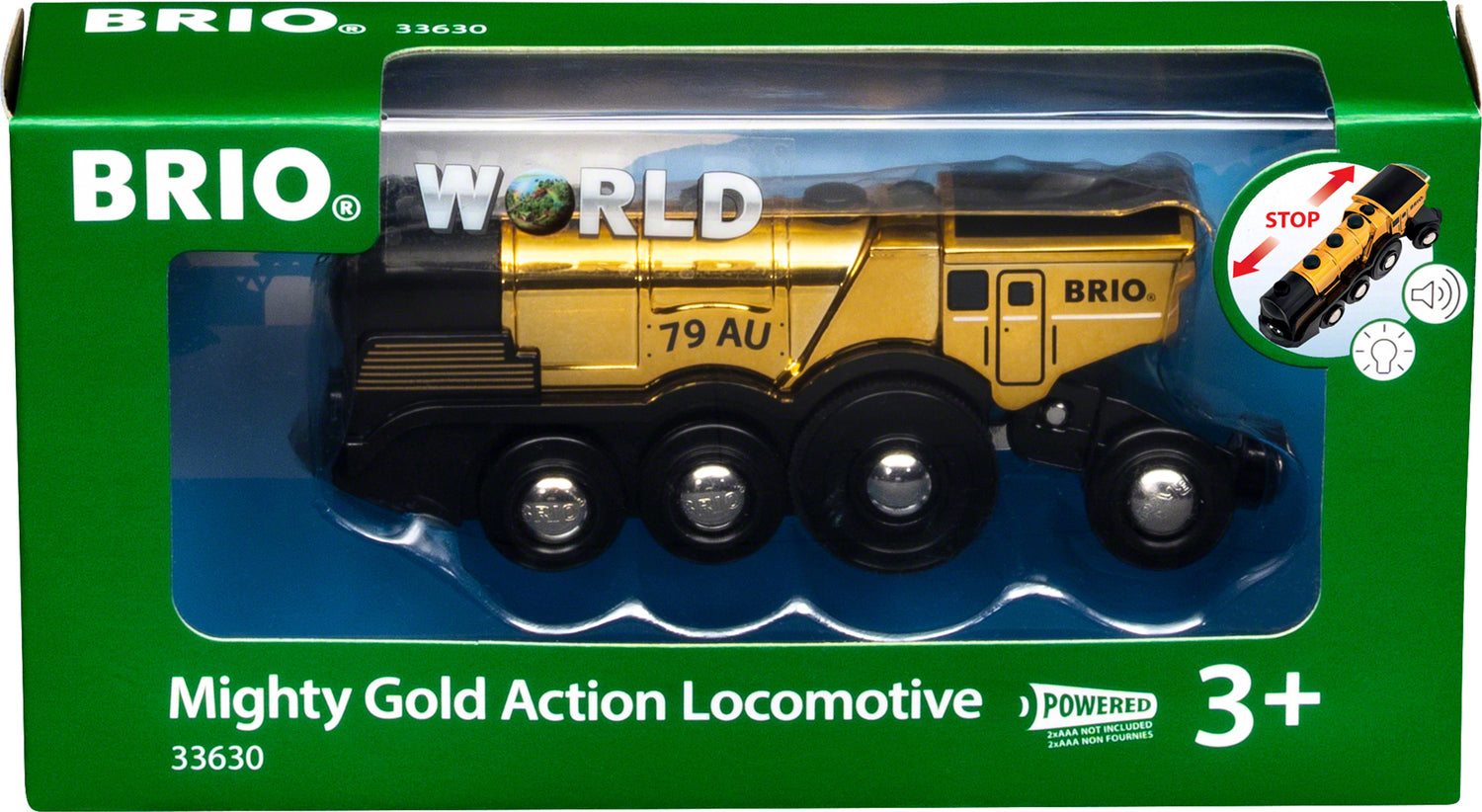 With its shiny gold, metalized paint and classic “choo-choo” sound, the 33630 Mighty Gold Action Locomotive impresses everyone as it flies down the tracks at high speed. This battery-powered toy train is one of the strongest in BRIO World and drives forward and reverse with accompanying light and sound effects. It also features a switch on top which allows you to use the train without the battery function – disengaging the axel for free-wheel rolling. This retro designed train helps your child’s development by promoting logical thinking and improving fine motor skills.