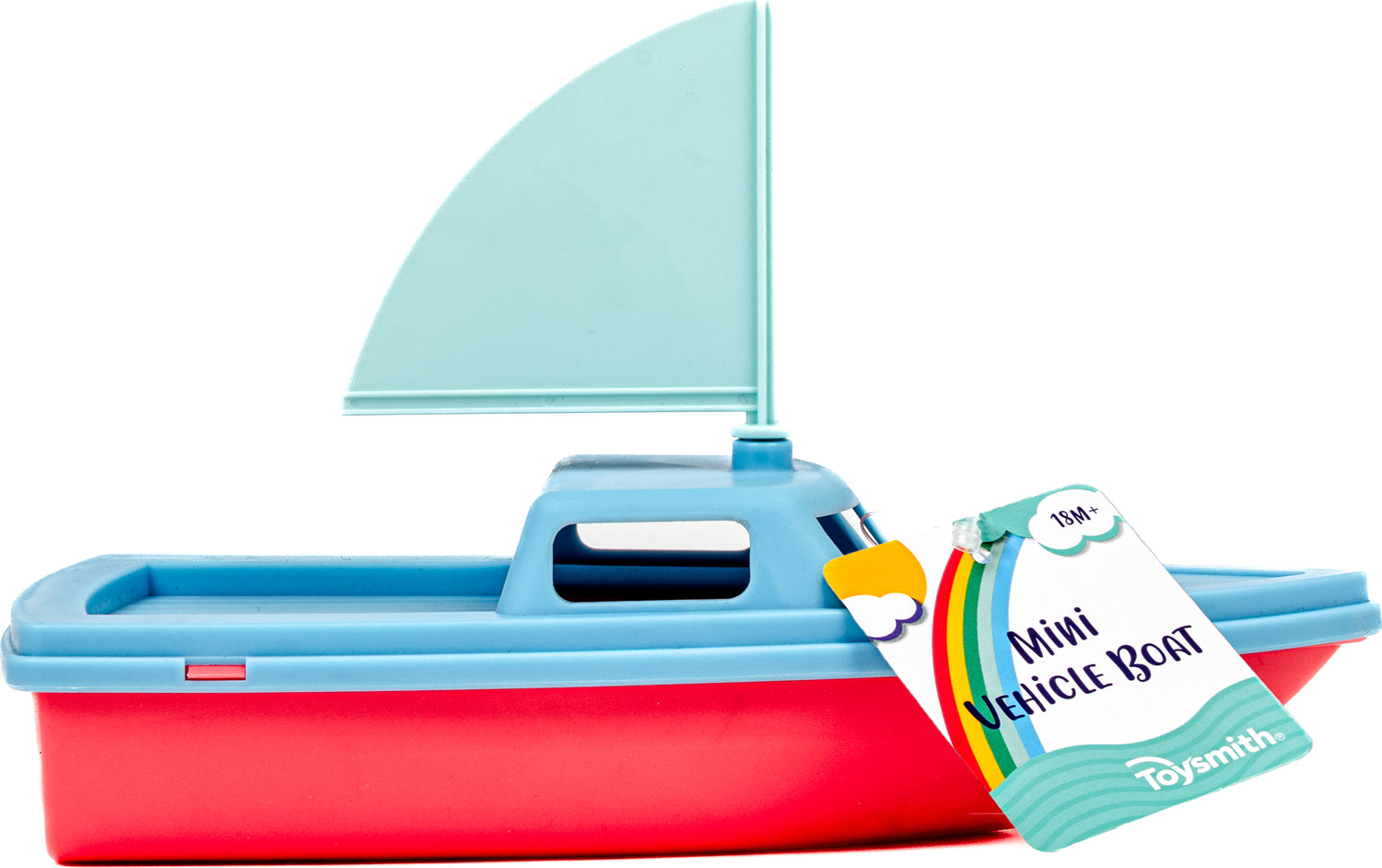 Cruise around the open waters with Toysmith’s Mini Vehicle Boat. Made of durable plastic, the toy boat is lightweight and floats on the water. The boat is blue with a red base and has a teal flag at the top. The flag can be adjusted to help guide the direction of the boat while it sails. Great for pretend play, relaxing, or racing with a friend.