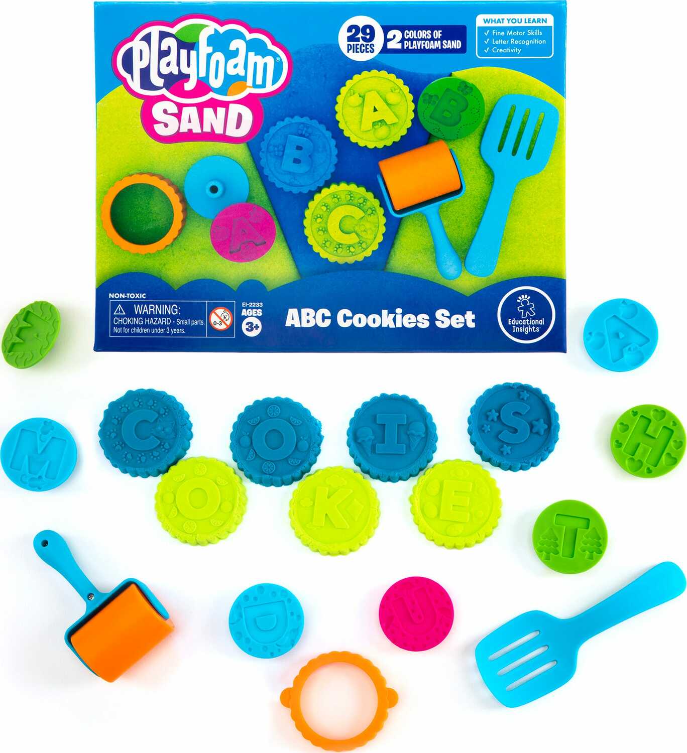- Includes 2 8-ouce packs of Playfoam Sand, cookie cutter, 26 letter stamps, spatula, and roller