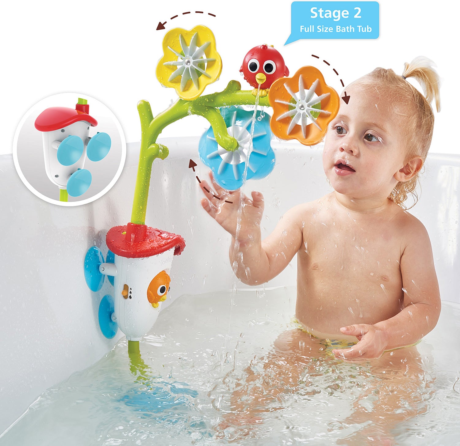 Battery operated sensory bath mobile with colorful flowers that spin and sprinkle while swiveling bird sprays a gentle stream of water.