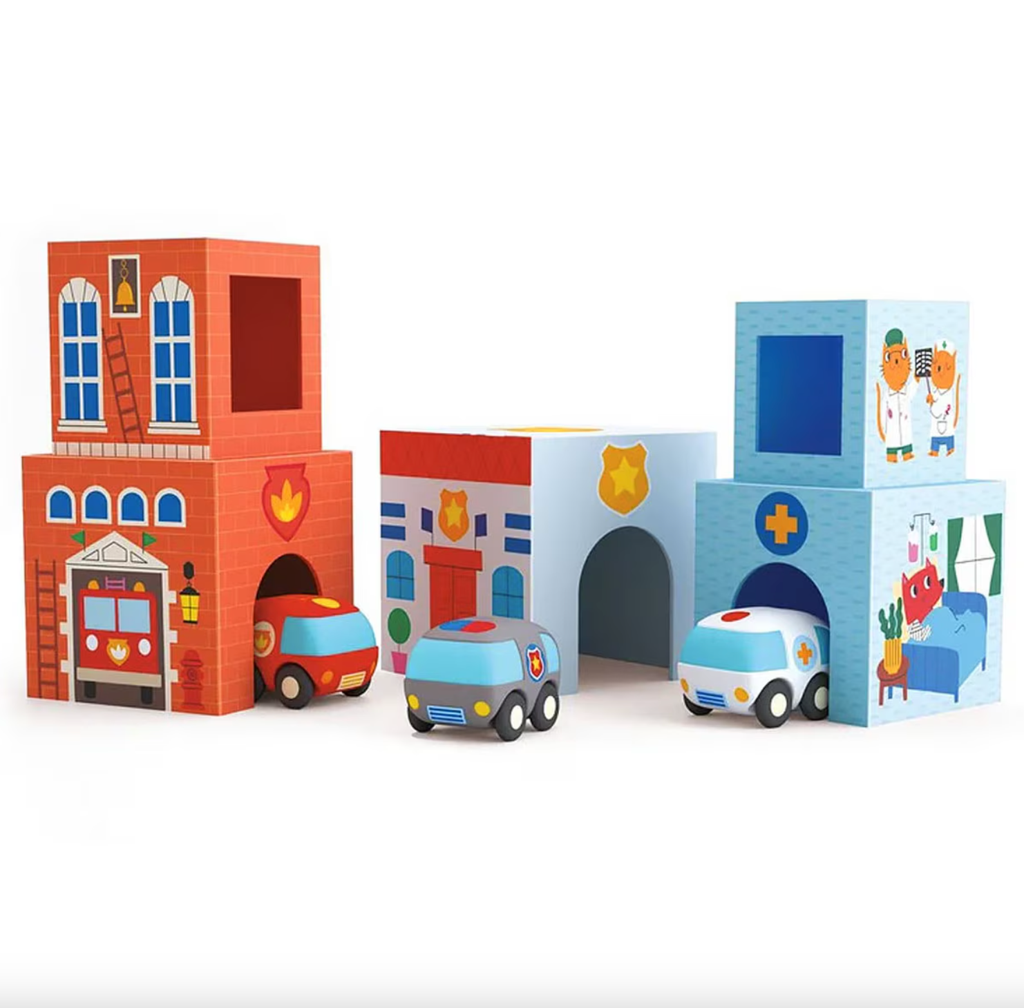 Coated heavy cardboard, very durable, very brightly printed. Set comes with vehicles and structure pieces. Adorable vehicles are made of soft PVC and are washable. Each block is colorful with great graphics on all sides that show emergency service buildings, including a number to encourage recognition and ordered stacking. Boxes nest for easy storage when not in use. Set includes 5 blocks and 3 vehicles.